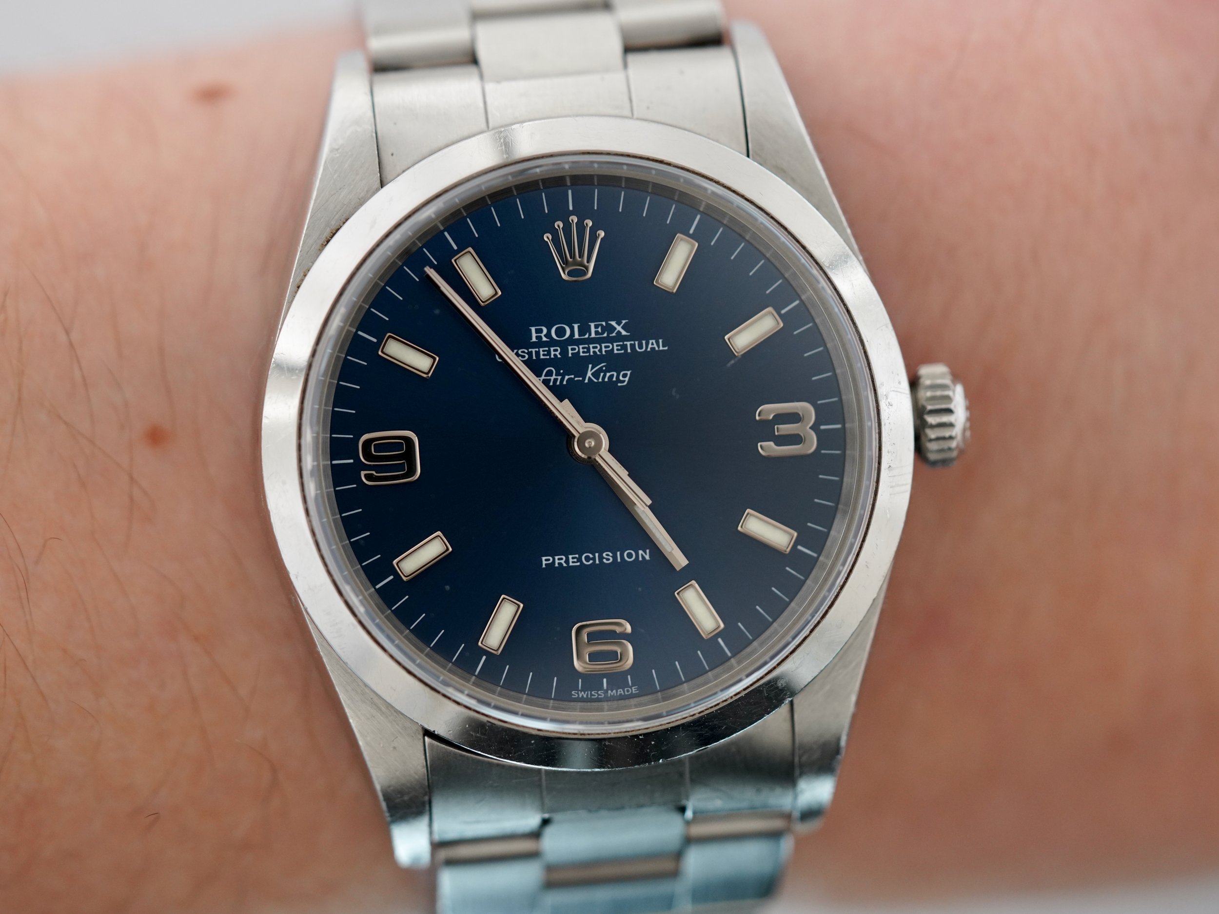 Bracelet condition: The bracelet is in good condition. The Oyster bracelet shows slight stretching which is normal for this type of strap. The buckle has a deeper scratch in the upper right corner. The Rolex logo on the buckle is still tactile.